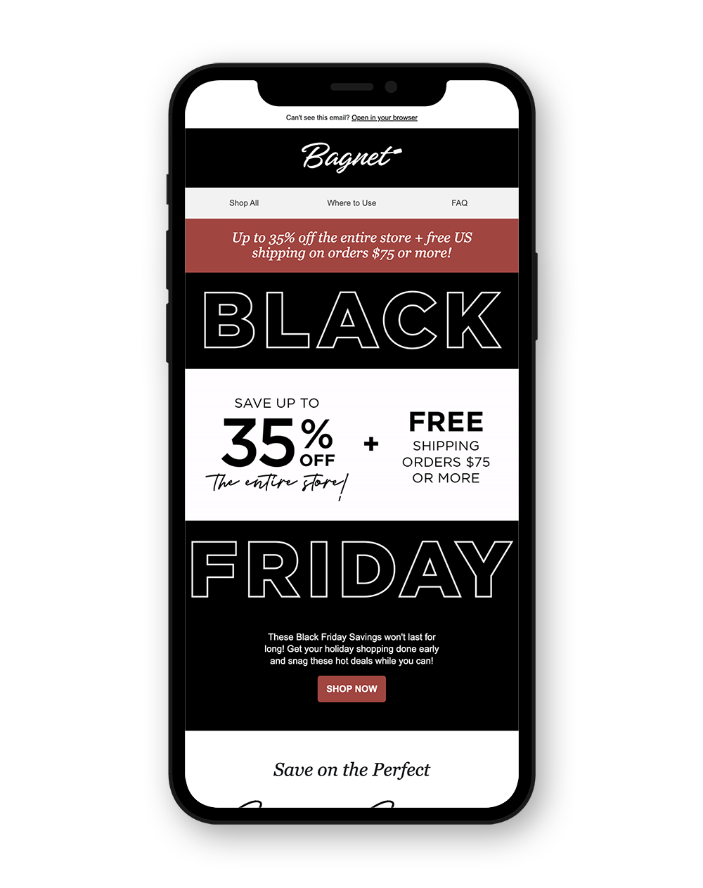 Create a cohesive look and feel for Bagnet’s Black Friday Sale that can be used across marketing emails, texts, the website, social media posts, and paid social ads. Must be bold, eye-catching, and use the branded red for large blowout sales.