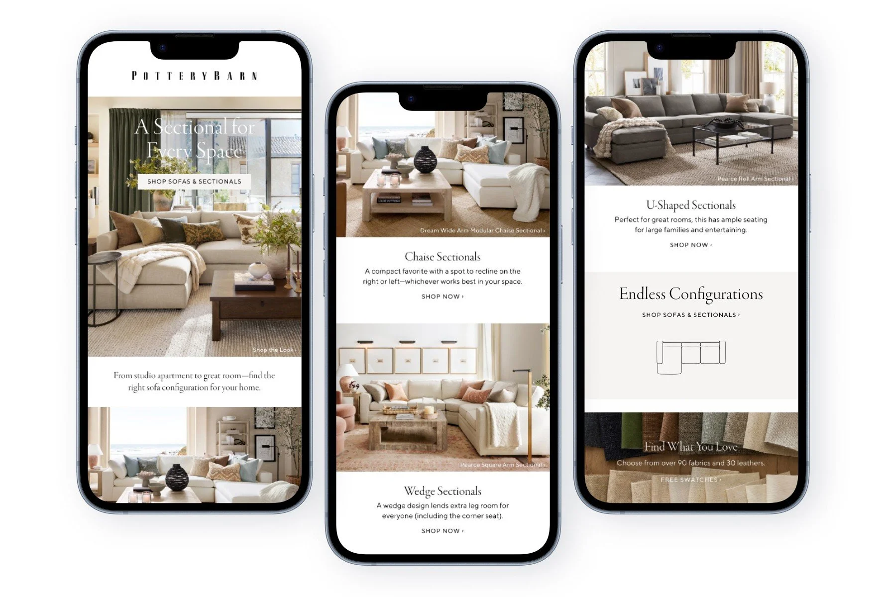 Sectionals are one of Pottery Barn’s most customizable products, made to order for the perfect fit in any space. This marketing campaign aims to break down the different types of sectionals and which spaces they’re best for.